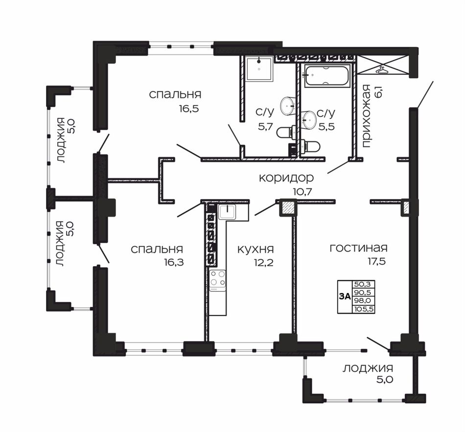 3-комнатная — 106 м² 3/17 эт. в Театрал