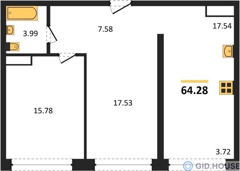 2-комнатная — 64,6 м² 19/24 эт. в Гарантия на Обрывной