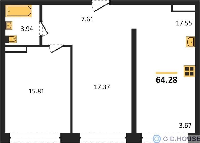2-комнатная — 64,6 м² 17/24 эт. в Гарантия на Обрывной