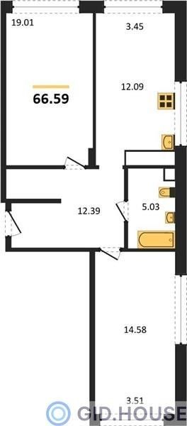 2-комнатная — 67,04 м² 19/24 эт. в Гарантия на Обрывной