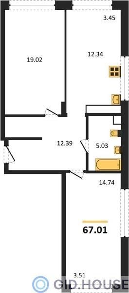 2-комнатная — 67,29 м² 10/24 эт. в Гарантия на Обрывной