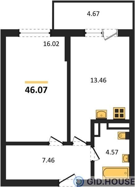 Квартира: 1 к 46,07 кв.м., 13 этаж в комплексе Спутник, 1 очередь, корп.1, сдача: 2кв. , этажей: 16, адрес Краснодар г., Агрономическая ул., д. 2/1/1, Застройщик: СтройГрад-Юг.