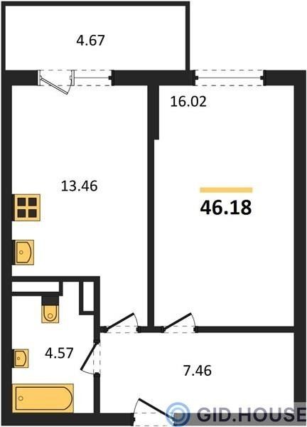 1-комнатная — 46,18 м² 7/16 эт. в Спутник