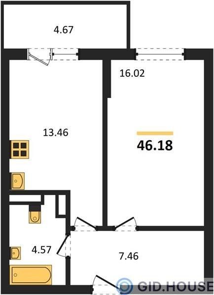Квартира: 1 к 46,18 кв.м., 2 этаж в комплексе Спутник, 1 очередь, корп.1, сдача: 2кв. , этажей: 16, адрес Краснодар г., Агрономическая ул., д. 2/1/1, Застройщик: СтройГрад-Юг.