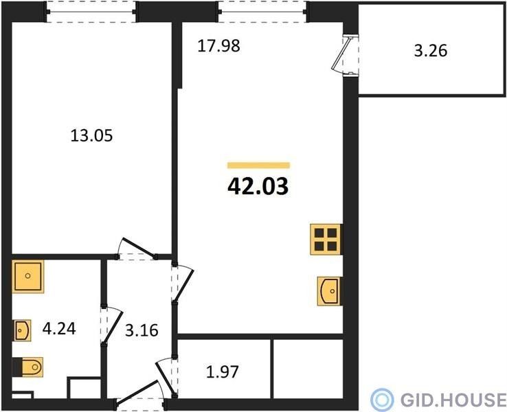 1-комнатная — 40,75 м² 8/9 эт. в Друзья