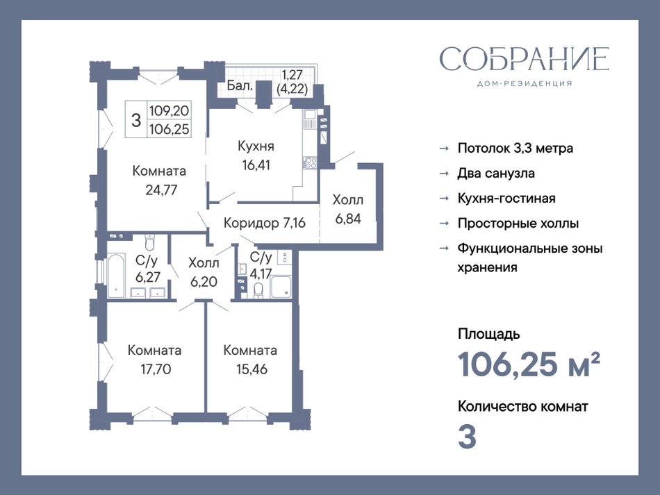 3-комнатная — 106,25 м² 3/7 эт. в Дом-Резиденция Собрание