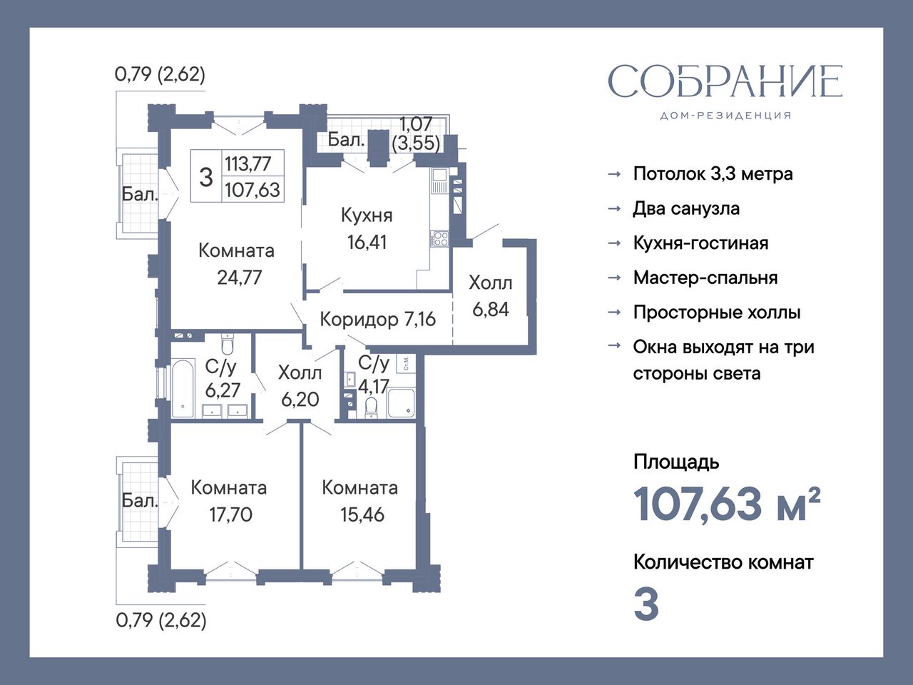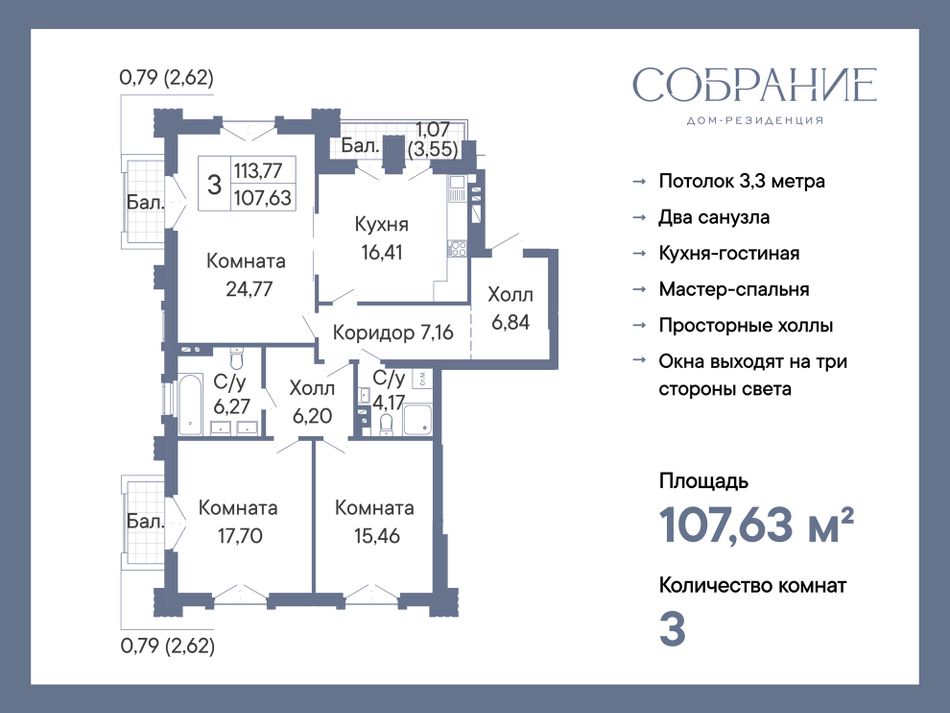 3-комнатная — 107,63 м² 6/7 эт. в Дом-Резиденция Собрание