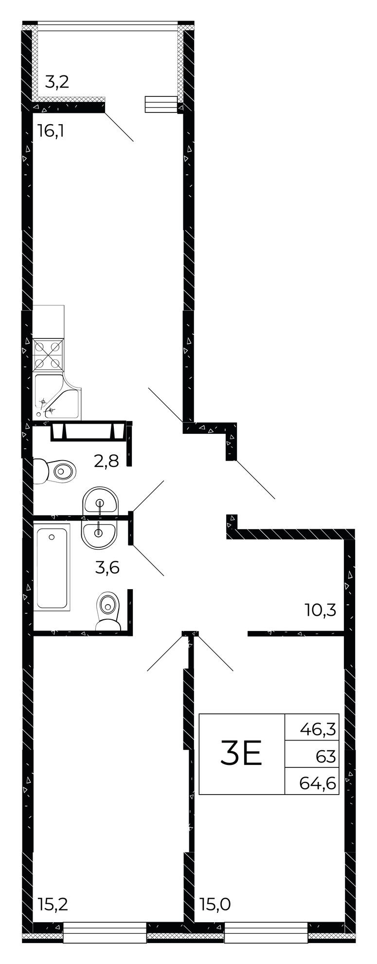 3-комнатная — 64,6 м² 2/15 эт. в Флора