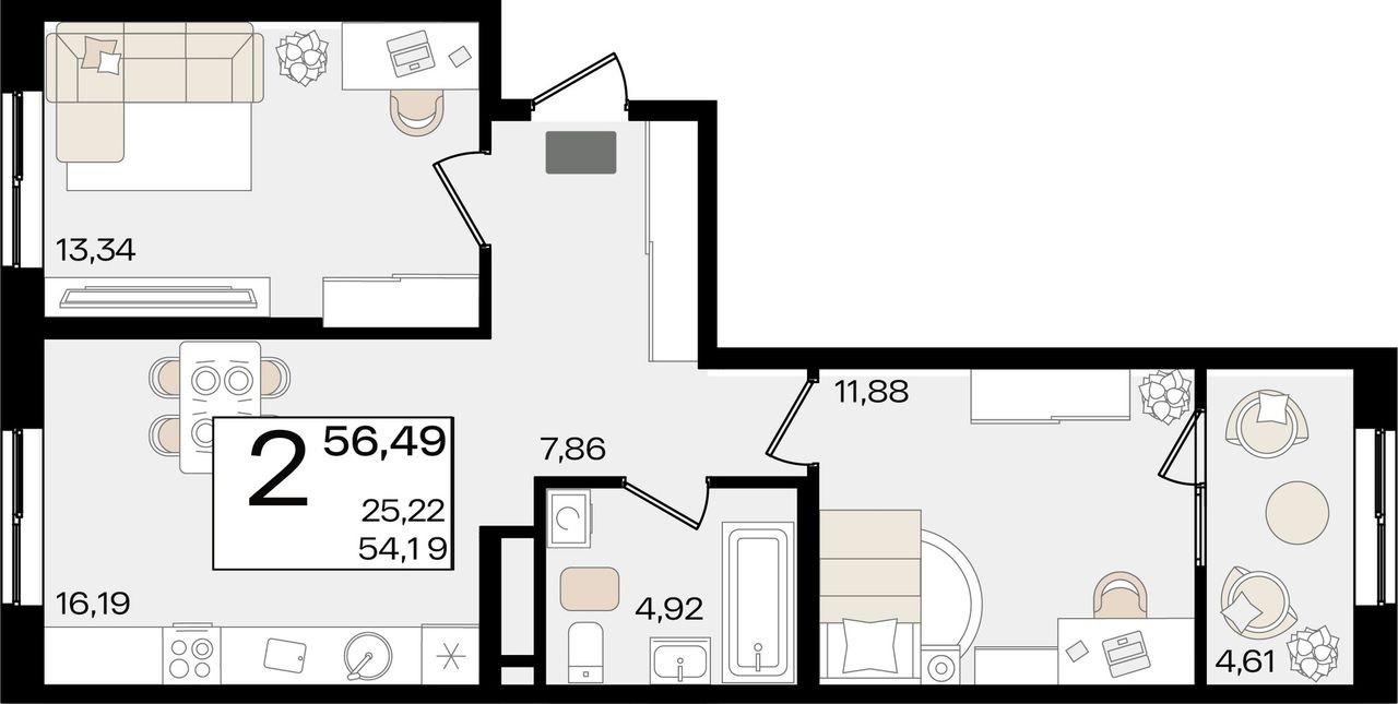 2-комнатная — 56,49 м² 3/18 эт. в Патрики
