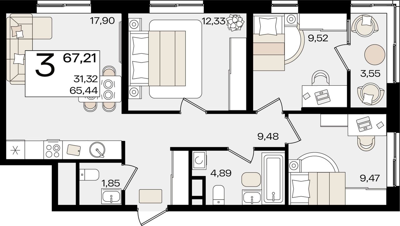 3-комнатная — 67,21 м² 2/18 эт. в Патрики