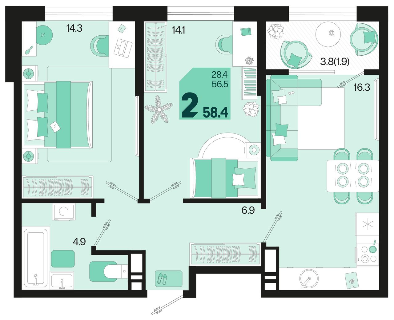 Общая площадь58,4 м²