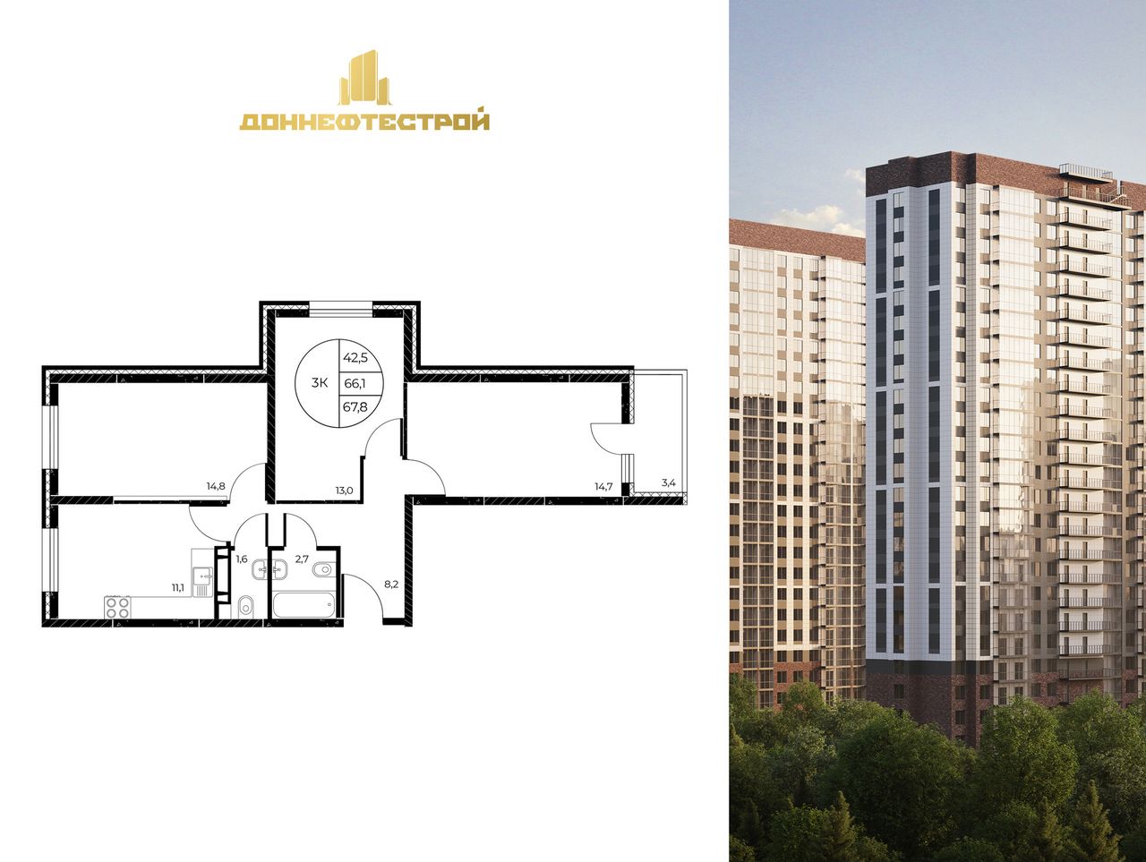 3-комнатная — 67,8 м² 8/25 эт. в Панорама на Театральном