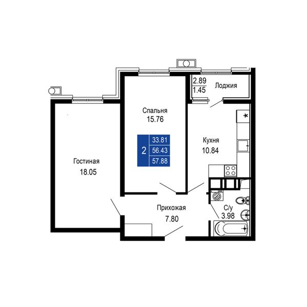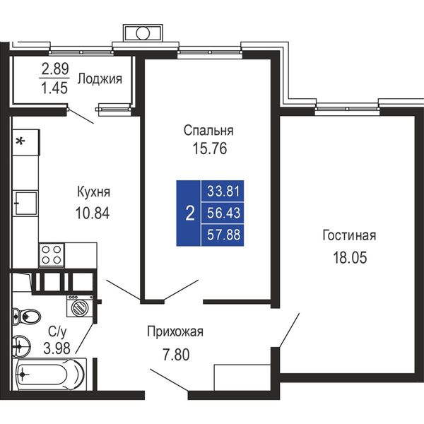 2-комнатная — 57,88 м²