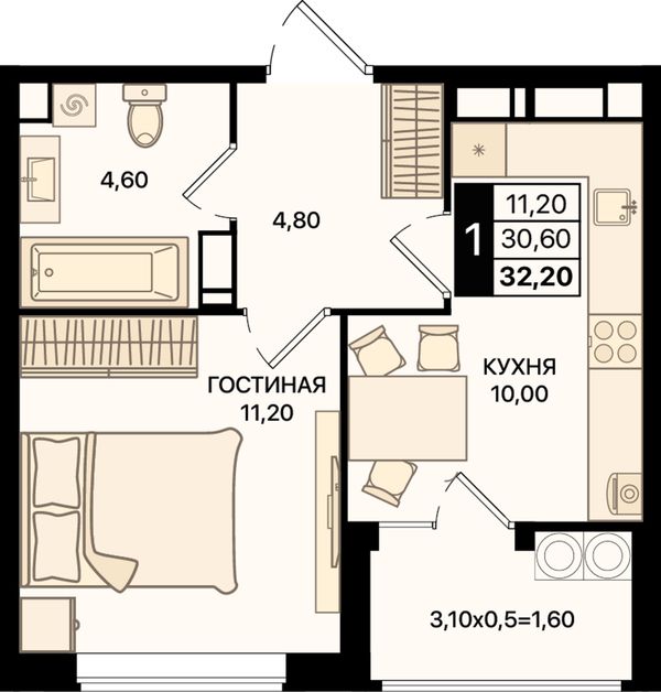 1-комнатная32,2 м²Ростовская область, Ростов-на-Дону, Первомайский, проспект Шолохова