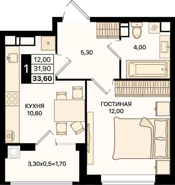 1-комнатная33,1 м²Ростовская область, Ростов-на-Дону, Первомайский, проспект Шолохова