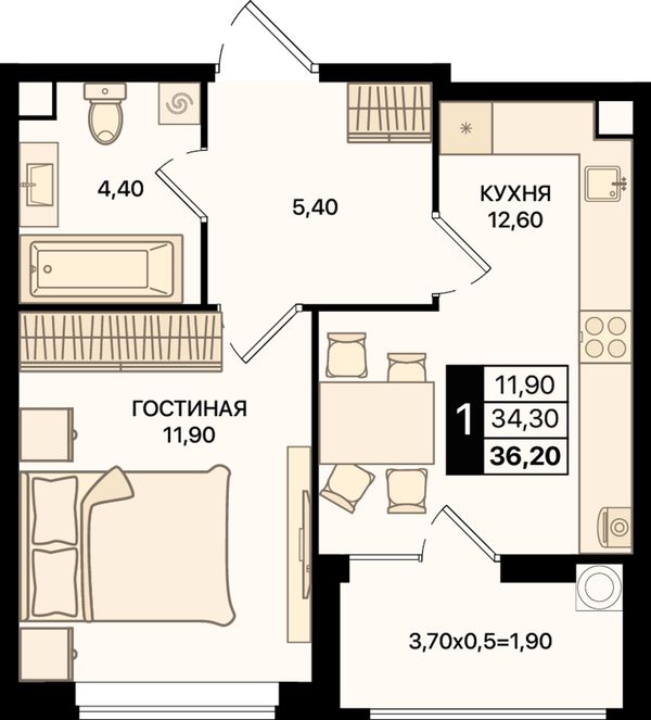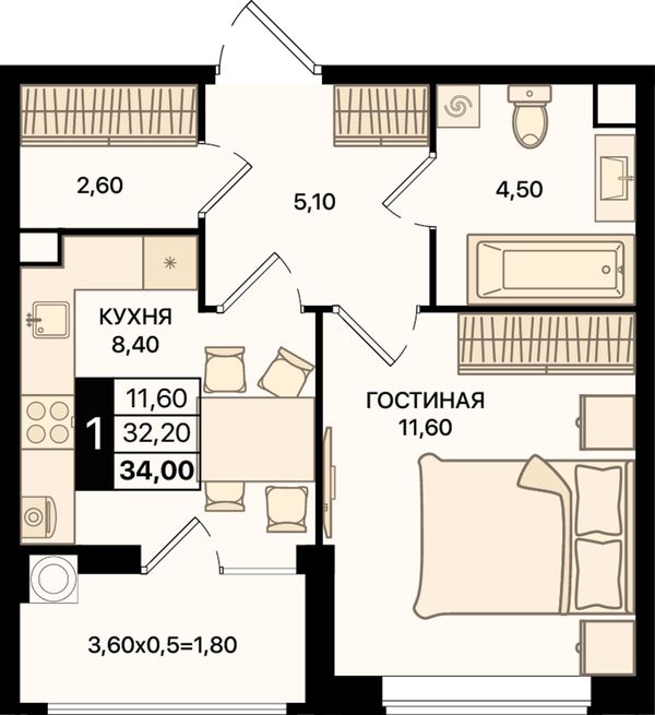 1-комнатная34,2 м²Ростовская область, Ростов-на-Дону, Первомайский, проспект Шолохова