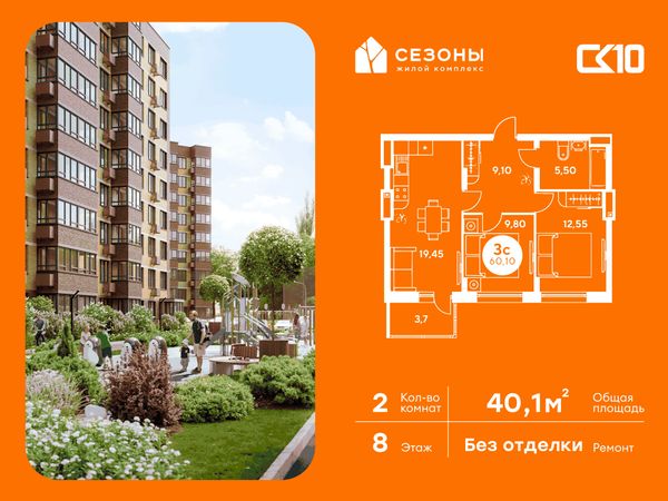 2-комнатная — 40,15 м²