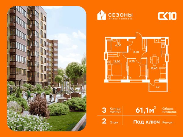 3-комнатная — 61,1 м²
