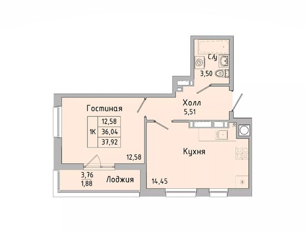 1-комнатная — 38,58 м²