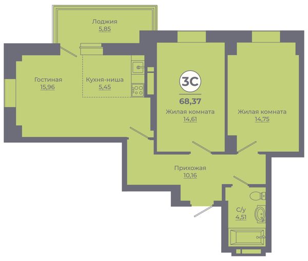 3-комнатная — 68,52 м²