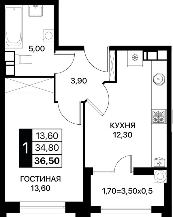 1-комнатная — 36,5 м²