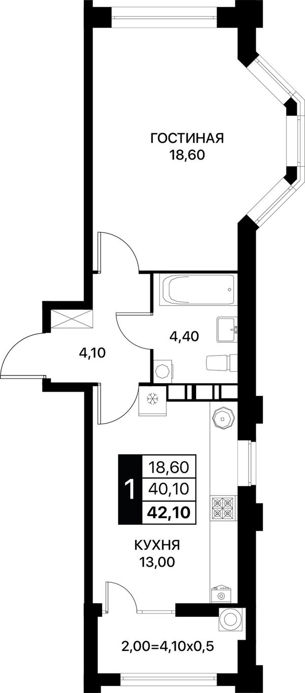 1-комнатная — 42,1 м²