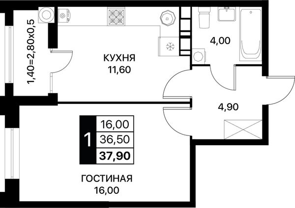 1-комнатная — 37,9 м²