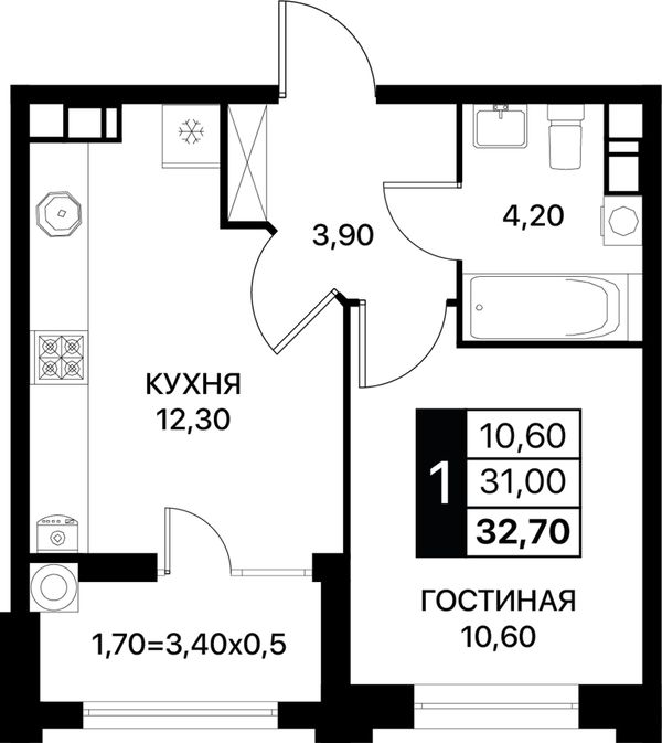 1-комнатная — 32,7 м²