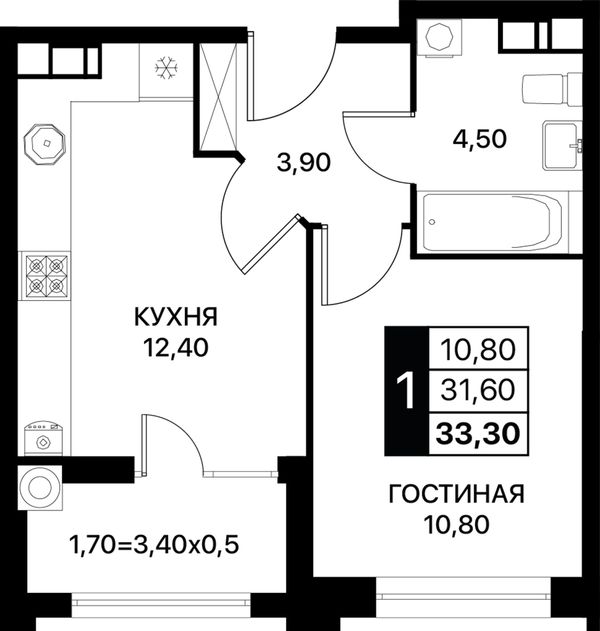 1-комнатная — 33,3 м²