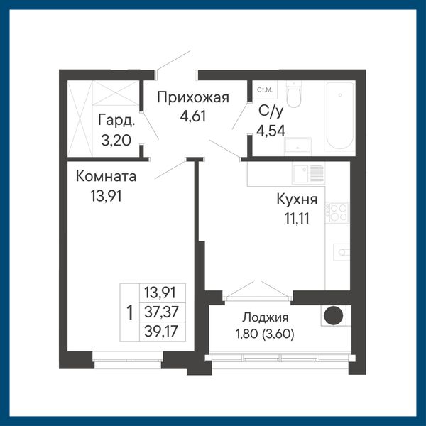 1-комнатная — 39,17 м²