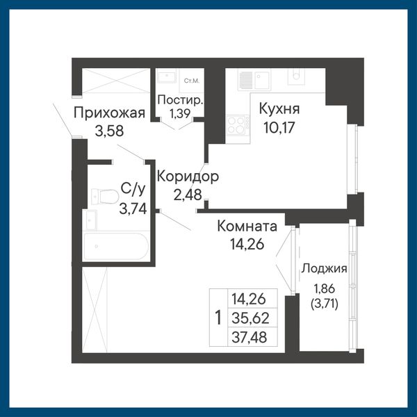 1-комнатная — 37,48 м²