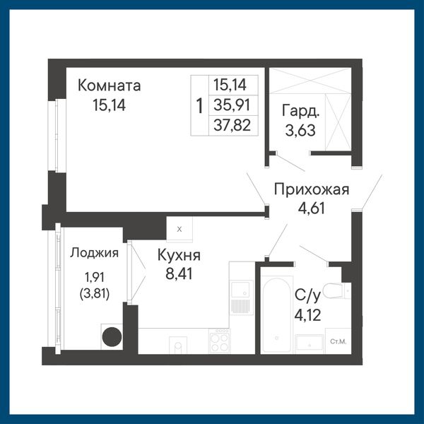 1-комнатная — 37,82 м²