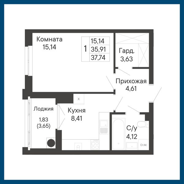 1-комнатная — 37,74 м²