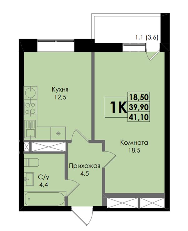 1-комнатная — 41,8 м²