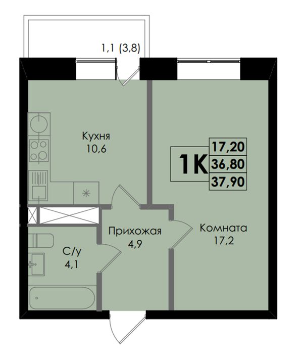 1-комнатная — 37,9 м²