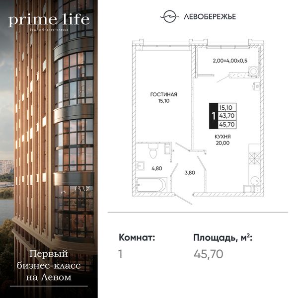 1-комнатная45,9 м²Ростовская область, Ростов-на-Дону, Левобережная улица, 6/1с2