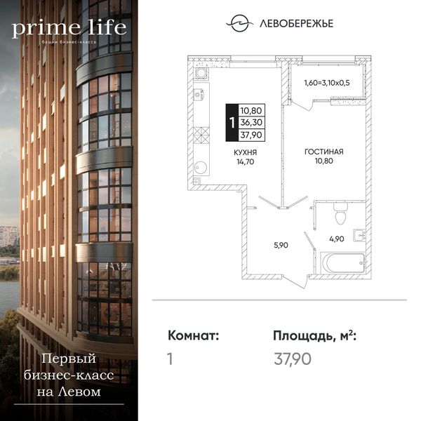 1-комнатная37,9 м²Ростовская область, Ростов-на-Дону, Левобережная улица, 6/1с2