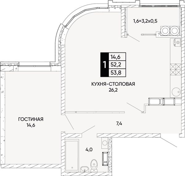 1-комнатная53,8 м²Ростовская область, Ростов-на-Дону, Левобережная улица