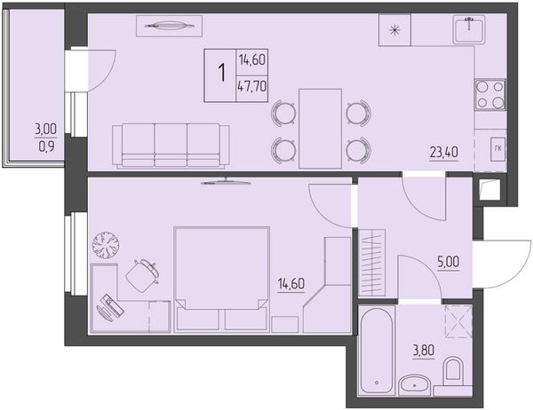 1-комнатная — 47,7 м²