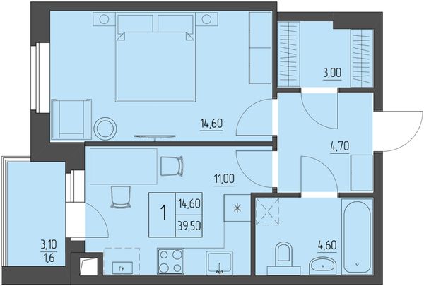 1-комнатная — 39,5 м²