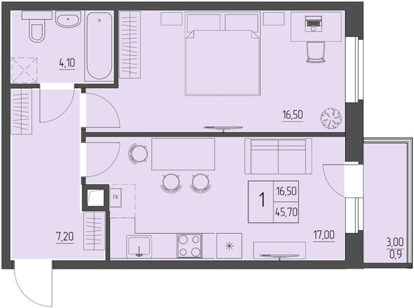 1-комнатная — 45,7 м²
