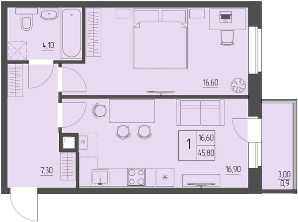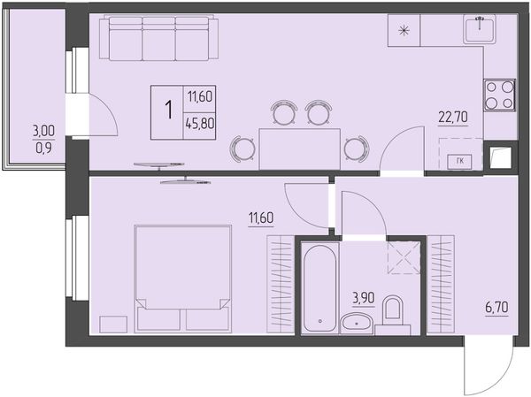 1-комнатная — 45,8 м²