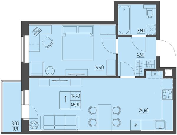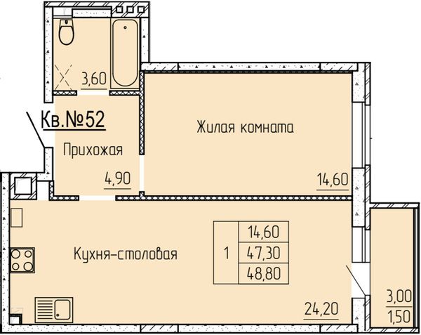 1-комнатная — 48,3 м²