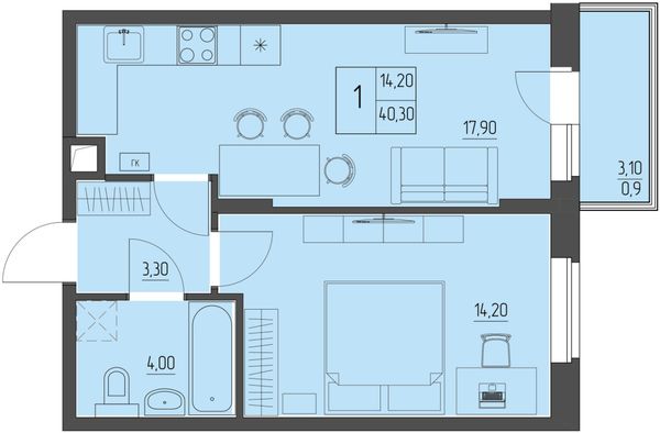 1-комнатная — 40,3 м²