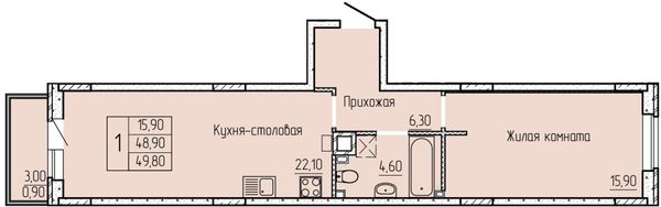1-комнатная — 49,3 м²