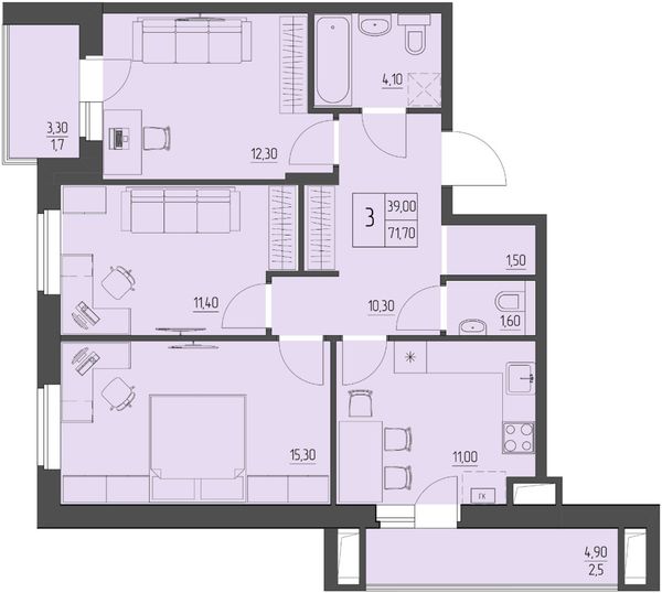 3-комнатная — 71,5 м²