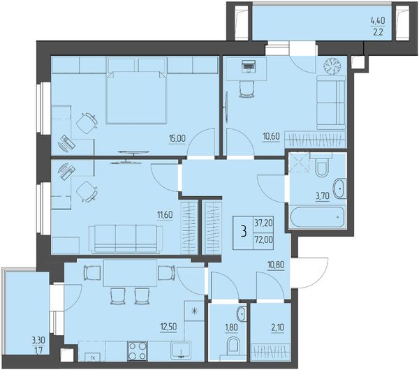 3-комнатная — 72,2 м²