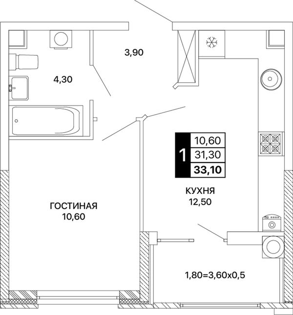 1-комнатная — 33,1 м²
