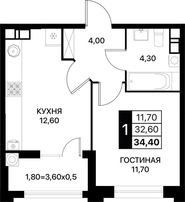 1-комнатная — 34,4 м²