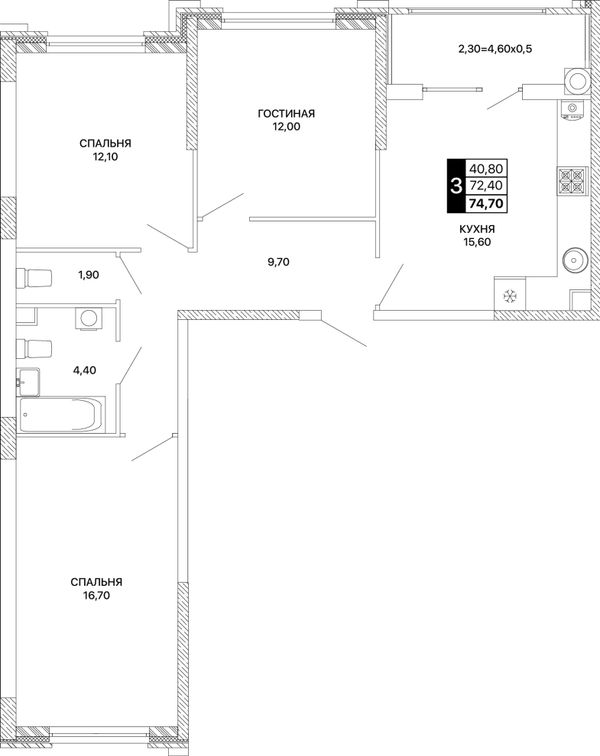 3-комнатная — 74,7 м²